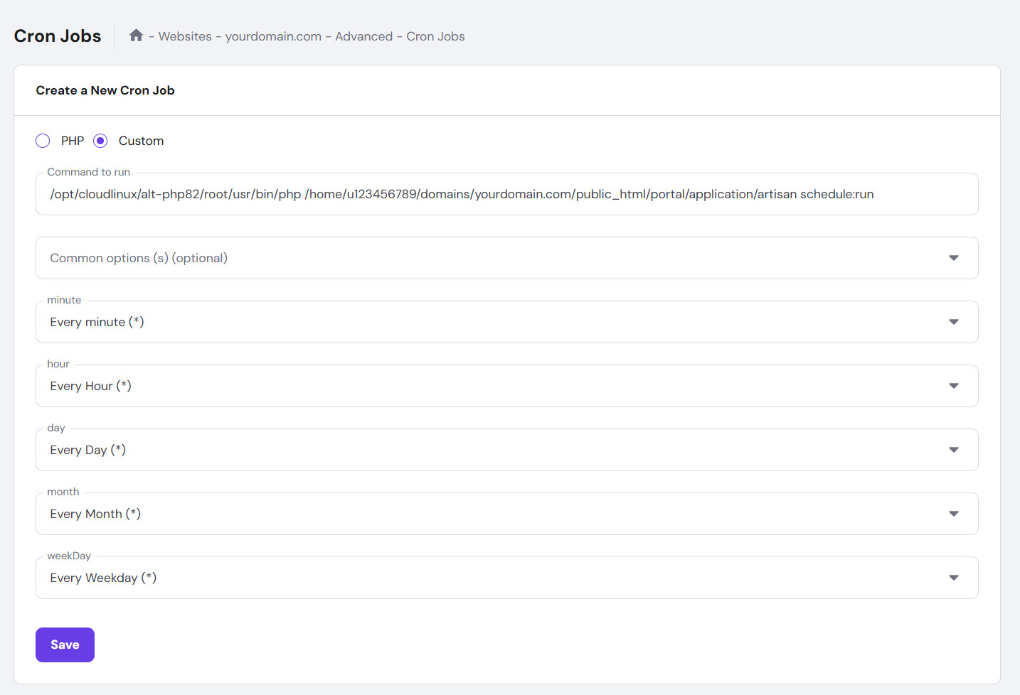 /opt/cloudlinux/alt-php82/root/usr/bin/php /home/u000000000/domains/yourdomain.com/public_html/application/artisan schedule:run