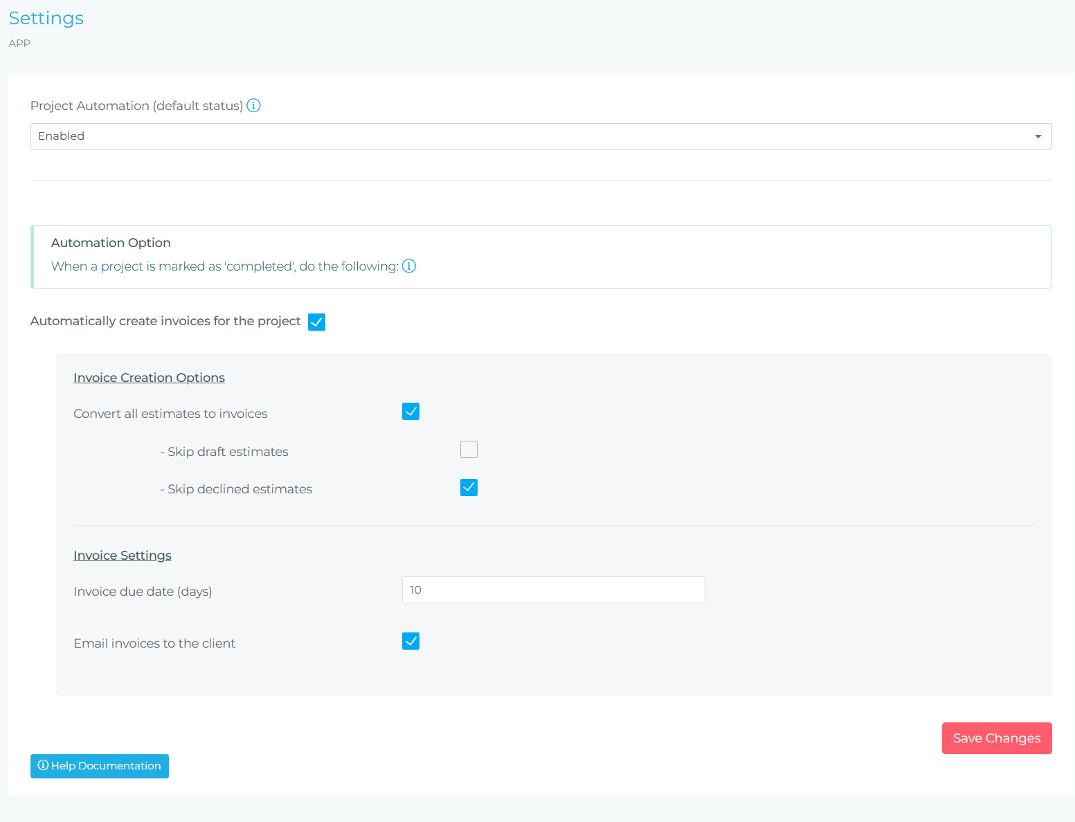 When a project is marked as completed, the automation can create invoices automatically. Enable this by checking the “Automatically create invoices for the project” option.