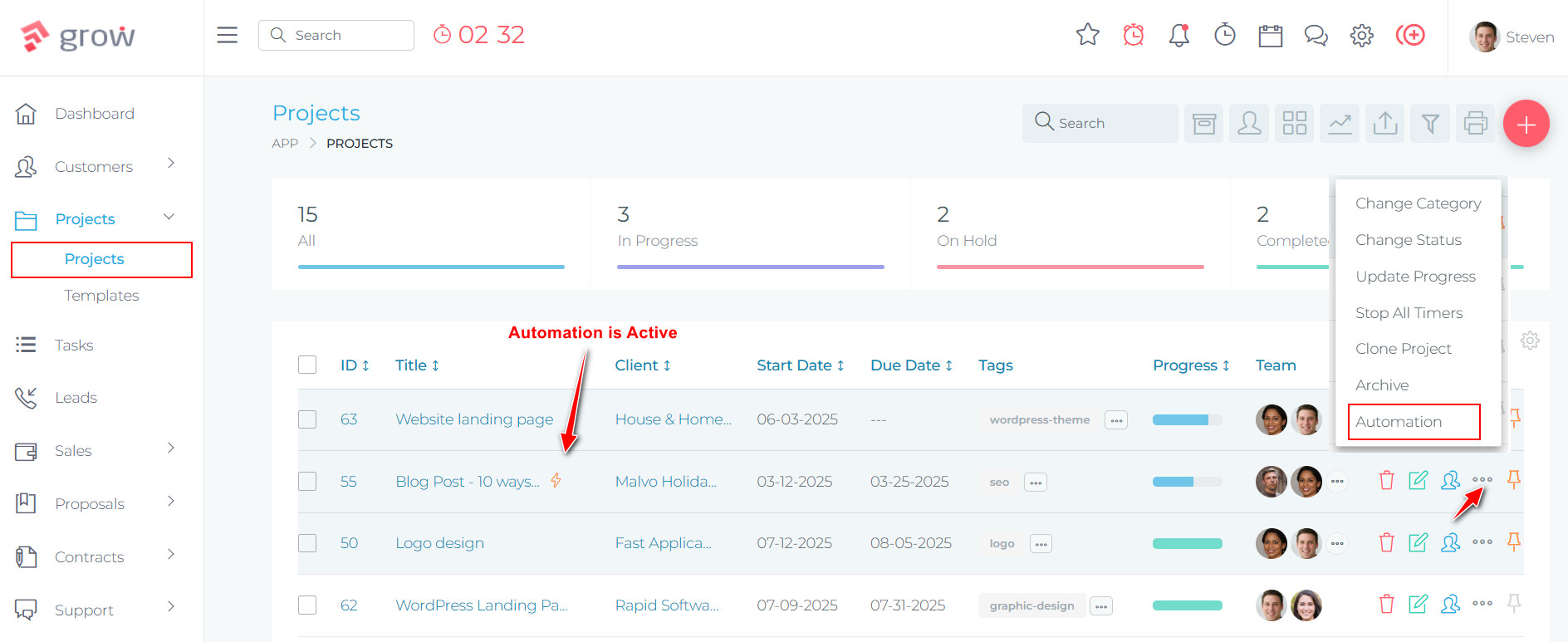 Alternatively, you can access automation settings directly from the projects page. Click on the three dots menu next to any project, then select Automation.